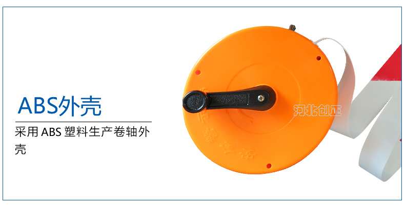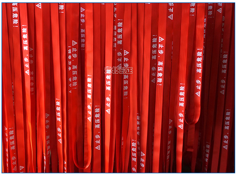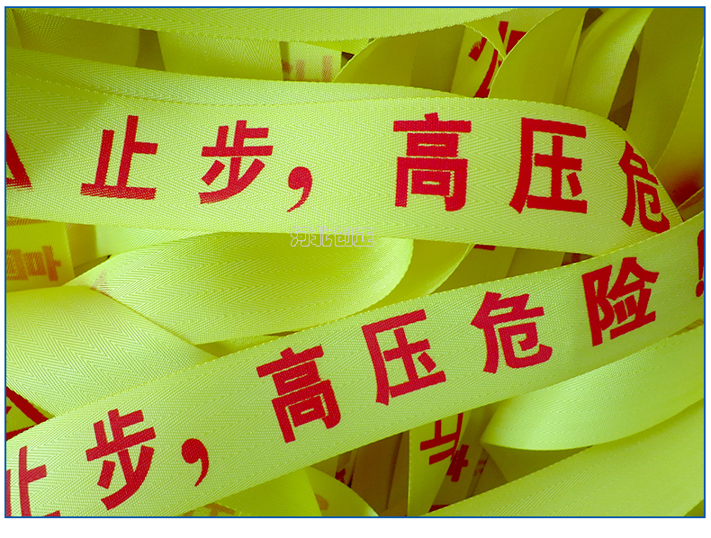 警示帶盒是ABS材料制成;帶是錦綸材質,上面印有“閃電符號,止步,高壓危險”等字樣。